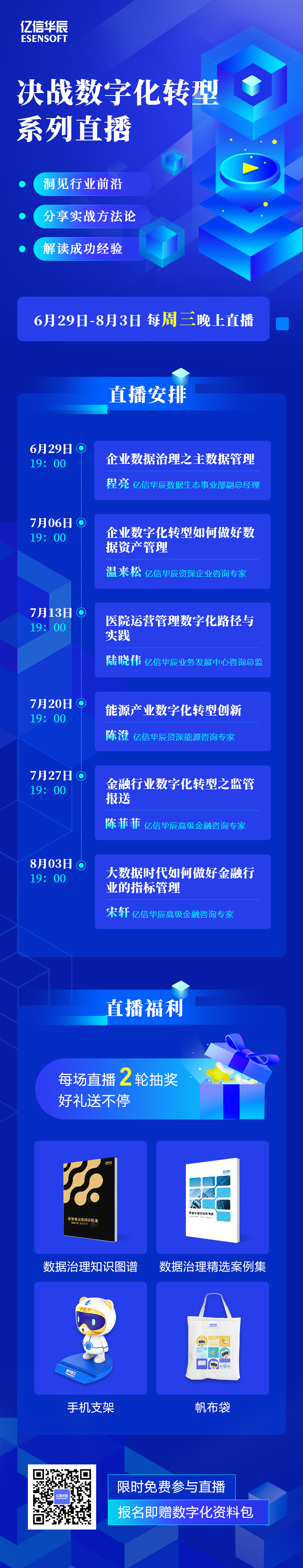 后疫情時代,轉型、升級、提質增效成為幾乎所有企業決策者都在關心的話題。尤其是在國家“十四五”數字經濟發展規劃公布之后,向“數字化”轉型,已成為我國經濟發展的大趨勢,也成為了企業發展的必經之路。 數字化轉型究竟應該如何轉?企業決策者可以從哪些實際工作層面著手搭建企業的數字化?又有哪些典型行業應用案例可供參考?億信華辰深耕政企大數據領域16年,作為國內領先的數據治理和數據分析產品與服務提供商,精心籌辦“決戰數字化轉型”系列直播,旨在從思路、工具、實踐多個角度,分享如何通過數字化手段實現轉型升級。 6月29日-8月3日,六周時間,每周三晚上19:00-20:30,為大家帶來精彩的直播干貨分享,內容包括: 多領域:主數據、數據資產、指標管理、數據治理…… 多視角:趨勢、路徑、場景、案例、方法論…… 更有直播福利可以領取哦,觀看直播有機會獲得行業火爆的《數據治理知識圖譜》、《數據治理精選案例集》;并且全場直播PPT、視頻都將對外開放。   直播課程特色 1、聚焦轉型熱點,分享前沿理念 融合數百家大型企業數字化轉型實踐經驗,提煉數字化轉型方法論及實踐路徑,億信華辰咨詢團隊大拿授課。 2聚焦標桿典范,剖析最佳實踐 通過案例解讀,從主數據、數據資產、指標管理、監控報送、統計上報等不同維度剖析數字化轉型痛點、難點與最佳實踐。 直播課程安排