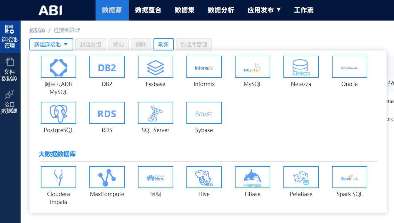第一步,就是對接數(shù)據(jù)庫,億信ABI支持對接包括:Mysql、Oracle、SQL Server、DB2、GBase、PetaBase、Essbase等多種數(shù)據(jù)庫,而且還支持各種其他類型文件的導(dǎo)入數(shù)據(jù),包括excel、txt、csv、db等等文件。