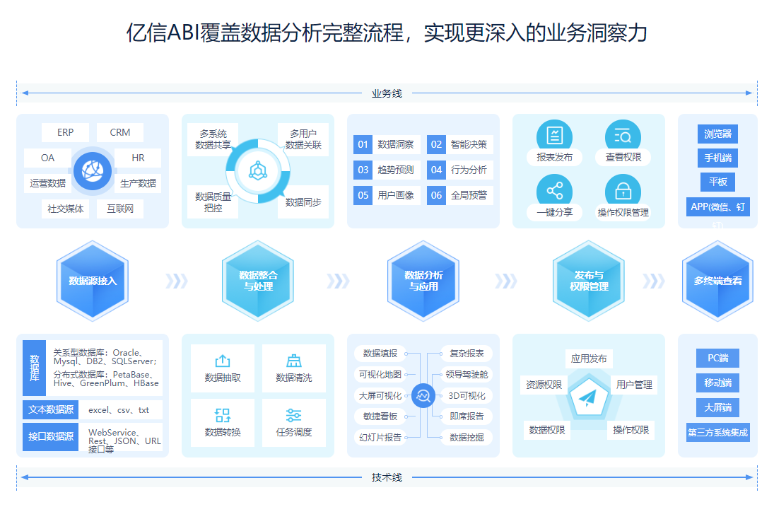 在這個信息爆炸式增長的時代,挖掘數據的潛在價值尤為重要,越來越多的人將目光聚集于商務智能BI領域。通過數據分析軟件對來自不同的數據源進行統一的處理和管理,并以靈活的方式展示數據之間的聯系,輔助企業進行決策。 在BI越發重要的今天,如何學習BI應用并熟練掌握它呢?總結一下,大致需要從五個方向著手: 1、學習數據庫知識,掌握基礎技能sql 直白來講,BI就是玩數據的,從數據中獲取各種所需信息。因為BI的出發點是數據,希望能夠從數據分析中得到有價值的信息,所以從事BI相關的工作是絕對離不開數據庫的。 2、技術方面,學習數據倉庫/ETL以及前端開發 那么,為什么要學習數據倉庫呢?首先,我們認識一下數據倉庫。 數據倉庫,是為企業所有級別的決策制定過程,提供所有數據類型支持的戰略集合。它出于分析性報告和決策目的而創建,為需要業務智能的企業,提供指導業務流程改進、監視時間、成本、質量以及合理控制它們。從數據倉庫的定義以及作用可以看出它和BI的作用完美契合,是BI的核心組成部分。 數據倉庫和數據庫僅有一字之差,但它們的作用卻不相同。數據倉庫和數據庫的區別實際來講就是OLTP和OLAP的區別。傳統數據庫系統主要是用聯機事務處理OLTP(OnLine Transaction Processing),也叫操作型處理,它是針對具體業務在數據庫聯機的日常操作,通常對少數記錄進行增刪改查。用戶較為關心操作的響應時間,數據的安全性完整性以及并發支持的用戶數等問題。而數據倉庫使用的就是OLAP(OnLine Analytical Processing)了,也叫分析型處理,一般是針對某些主題的歷史數據進行分析,提供可靠結論以便支持決策管理。 數據倉庫學習了解后,接下來要學習ETL(Extract - Transform-Load)。ETL是數據倉庫的后臺,主要包含數據的抽取、清洗、規范化以及提交四個步驟。它是將數據從源系統加載到數據倉庫的過程。用來描述講數據從來源端經過萃?。╡xtract)、轉置(transform)、加載(load)至目的端的過程。ETL一詞較常用在數據倉庫,但其對象并不限于數據倉庫。從OLTP(聯機事務處理)數據庫中提取數據,將其轉換為與數據倉庫模式匹配并加載到數據倉庫中。 數據倉庫作為提供所有數據類型支持的戰略集合,對于BI分析數據模型是至關重要的,而ETL從數據庫中提取,清洗數據加載到數據倉庫中,作為連接數據庫和數據倉庫的紐帶,在我們想要學好BI的前提下,學習ETL也是必不可少的。 當然,這些都是數據層面(底層)的東西,里子有了,當然面子也需要做好。對于BI來講,數據分析后,我們很有必要將分析得到的結果以清晰炫酷的方式展現出來,做到第一時間抓住人們的眼球。這就需要我們有良好的前臺代碼基礎。 3、選擇技術工具 一個好的工具,可以幫助我們快速牢固的掌握所需技能。 作為一款全能型數據分析工具,億信ABI不僅支持連接類似oracle、mysql之類的數據庫,還支持類似文件數據或者網絡接口數據,數據來源支持廣泛;億信ABI的分析方式也很豐富,可以滿足市場上的各種場景需求,不論是中國式復雜報表,還是類似天貓雙十一作戰大屏的交互式炫酷效果,它都能實現;億信ABI系統的擴展性和穩定性都很OK,對于大數據量的數據分析,實現系統的線性擴展的同時保證良好的系統穩定性;大數據時代,對數據處理的能力要求也變的更高,億信ABI就實現了千萬、千億甚至更大數據量數據的秒級響應。 作為行業內頂尖的一款BI工具,億信ABI可以很好地幫助我們學習BI,還可以免費試用呢。 4、學習業務知識 學習相關業務知識,任何行業都有屬于它自己的業務知識。 學習BI,我們要知道業務中的一些專業名詞,比如指標、維度、主題域、主體集、主題表等等,以及業務中的一些具體邏輯,這些對于我們在做BI分析的時候都是十分重要的。 5、實操數據分析工作 紙上學來終覺淺。在理論知識學好的情況下,更加注重的就是實踐了。在實際項目中認真參與,實操數據分析工作,把理論知識融會貫通。 相信只要能夠做好上面的五個方面,我們一定能夠擺脫菜鳥身份,向BI領域的大牛發起沖擊。