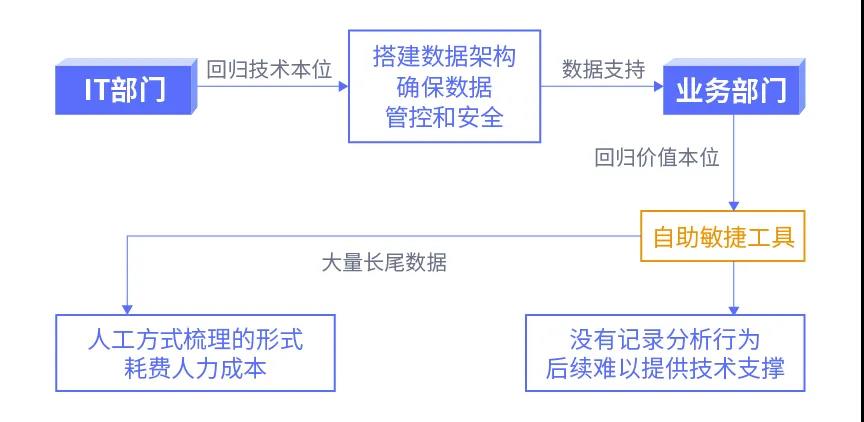 到了21世紀,以有一定IT能力的業(yè)務(wù)人員為中心的自助式數(shù)據(jù)分析平臺開始盛行,二代敏捷BI的熱潮襲來,在這段時間里BI廠商也如雨后春筍般涌現(xiàn),并競相大力發(fā)展可自助式分析的BI產(chǎn)品。雖然敏捷BI的出現(xiàn)一定程度上解決了部門協(xié)同的問題,但是敏捷BI對于長尾數(shù)據(jù)難以有效處理,同時分析經(jīng)驗和知識體系難以進行沉淀,IT部門很難在后續(xù)為其提供技術(shù)支撐,使其也有一定的局限性。