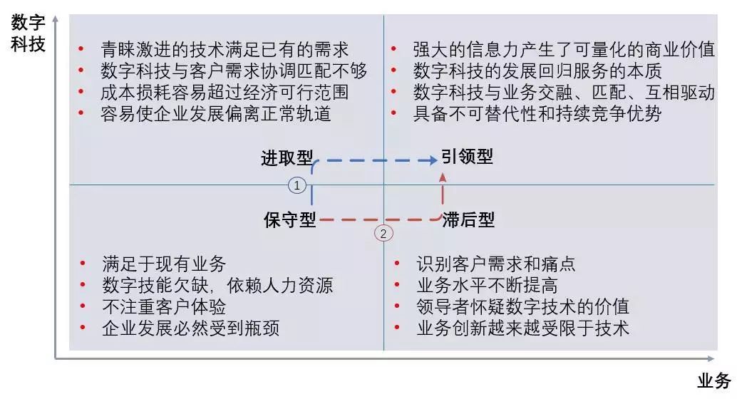 根據數字科技與業務各自發展程度及其交融與匹配度,可以將企業分成保守型、滯后型、進取型和引領型四種類型,如上圖所示。